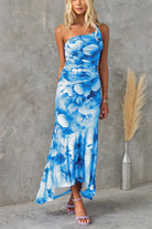 This graceful midi dress features a flattering one-shoulder design, enhanced by a bold floral print and a softly gathered waist. The body-skimming fit and subtle side slit create a beautifully feminine shape, perfect for special occasions or elegant evenings. With its romantic, flowing overlay and timeless silhouette, this piece adds just the right amount of sophistication to your wardrobe.
