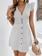 This dress features a V-neck design with ruffle cap sleeves and a stylish button front for an elegant yet relaxed look. The striped pattern adds a modern twist to this timeless style, making it perfect for various occasions. Whether you're attending a casual gathering or enjoying a day out, this dress offers the perfect combination of comfort and chic appeal.