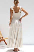 This tiered maxi dress for women brings together a flattering silhouette, a deep V-neckline, and soft ruffled straps that create a graceful frame around the shoulders. The smocked back adds comfort and shape, making it ideal for beach brunches or resort days. Its light, flowy skirt moves beautifully with every step—perfect for capturing that holiday state of mind.