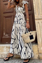Step into standout elegance with this geometric print maxi dress, designed with a flattering V-neckline, ruffle accents, and a softly tiered skirt that moves with grace. The structured waistline enhances the silhouette while the eye-catching print brings a modern edge to your daytime or vacation look. This piece perfectly balances comfort, style, and statement, ideal for strolls, brunches, or casual evenings.