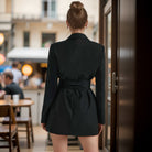 Women's Black Blazer Dress - Deep V-Neck with Tie Waist