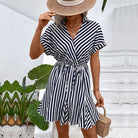 Step into versatile comfort and elegant style with our Women's Dark Blue Striped Wrap Dress. This charming dress features an elegant V-neckline and stylish short sleeves, perfectly complemented by a flattering adjustable waist belt for a tailored fit. Designed with a playful flared hem and practical side pockets, it offers a lightweight and breathable feel. Whether you're heading for a casual day out or a relaxing beach vacation, this dress can be effortlessly styled with sandals or wedges, making it an ideal choice for any occasion where comfort meets chic.