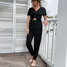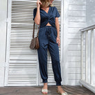 Elevate your wardrobe with our Women's Stylish Cut-Out Jumpsuit, a perfect blend of edgy design and sophisticated comfort. This jumpsuit features a trendy cut-out at the waist for a modern touch, complemented by an adjustable drawstring waistband that ensures a tailored and flattering fit for every silhouette. With its short sleeves offering a relaxed yet chic look, this versatile piece transitions effortlessly from day to night, whether you pair it with heels for a stylish gathering or sandals for a casual outing.