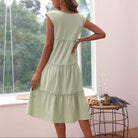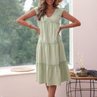 Step into effortless elegance and eye-catching style with our Women's Green Tiered Midi Dress. Designed for ultimate comfort and freedom of movement, this stunning dress features a flattering V-neck, delicate ruffle straps, and a beautiful three-layered design. Crafted from breathable materials, its flowy silhouette makes it the perfect choice for casual outings, beach visits, or lively summer parties.