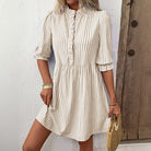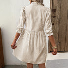 Step into effortless chic and playful style with our Women's Striped Ruffle-Hem Button-Up Mini Dress. This charming dress boasts a stylish stripe pattern that flatters all body types, complemented by an elegant ruffle-button front design. Trendy 3/4 puff sleeves add a modern touch while ensuring comfort. Made from lightweight and breathable fabric, this dress is incredibly versatile, perfect for casual outings with sandals or dressed up with heels for a night out, making it suitable for both everyday wear and special occasions.