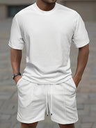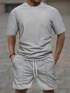 Keep things simple yet sharp with this waffle-knitted lounge set designed for men who value relaxed, sporty style and clean design. The round-neck short-sleeve top features subtle texture and pocket detail, perfectly paired with adjustable drawstring shorts for maximum ease. This go-to outfit is ideal for relaxing at home, walking outdoors, or travelling in comfort.
