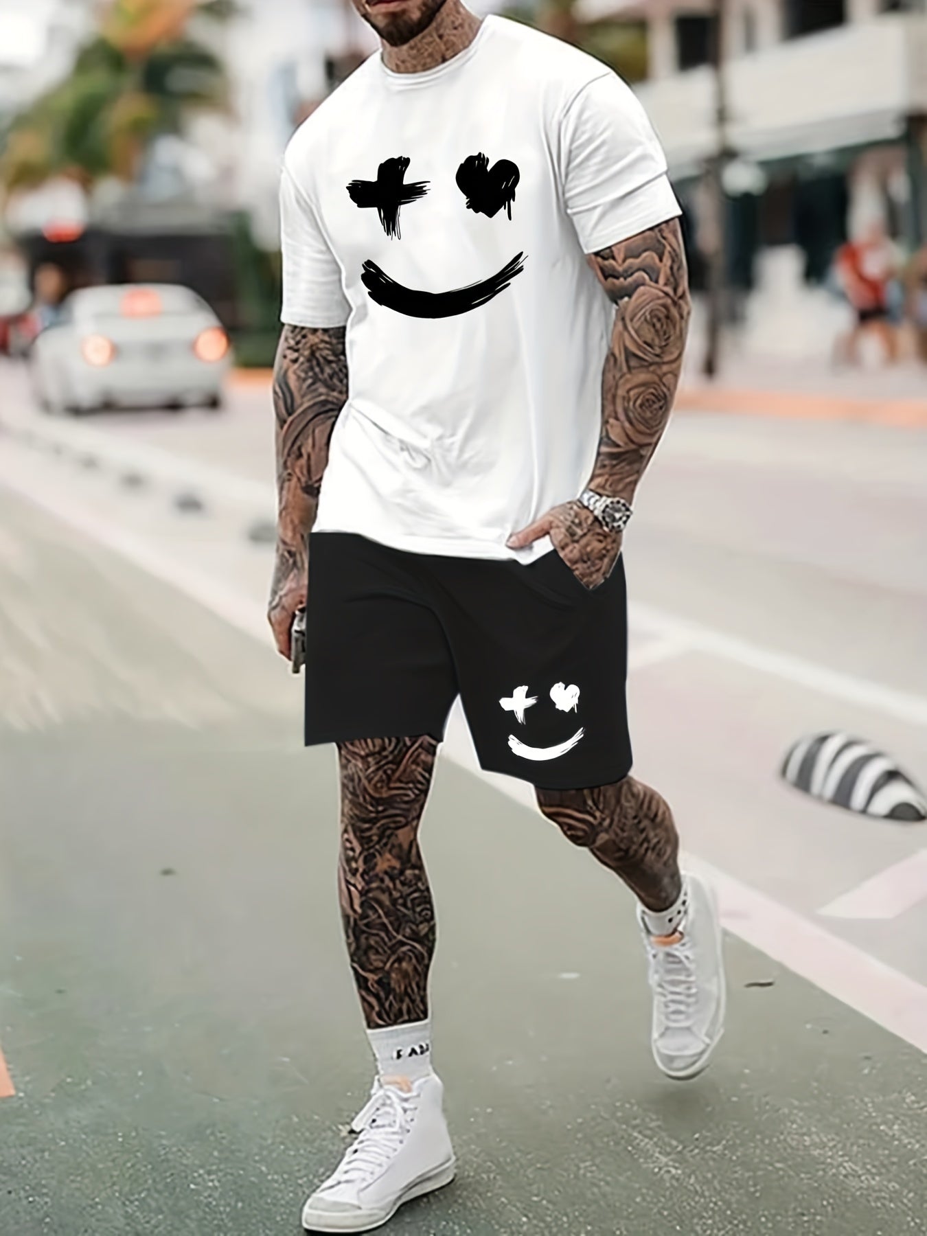 Add personality to your wardrobe with this smiley face print set designed for men who enjoy bold, casual looks. The short-sleeve tee features a striking graphic and pairs effortlessly with drawstring shorts for maximum comfort, ease, and fun styling. Whether you're on holiday, training, or relaxing, this outfit keeps you looking cool and confident.
