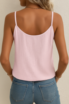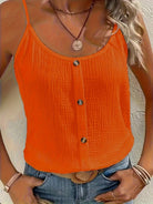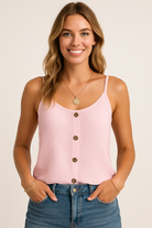 This sleeveless top is designed for warm weather ease and simple elegance, perfect for everyday wear. The button front detail adds a subtle accent while the slim straps and flattering neckline offer a fresh and feminine look. Ideal for pairing with jeans, skirts, or shorts, it’s a go-to choice for spring and summer outfits.