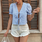 Women's Blue Checkered Puff Sleeve Crop Top - Tie-Front Summer Style