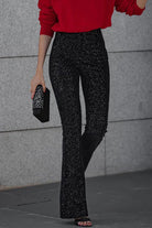 Introduce a touch of glamour to your seasonal wardrobe with these chic high-waisted flared trousers. Designed to create a flattering silhouette, these trousers offer a sleek and sophisticated look, perfect for both special occasions and stylish everyday wear.