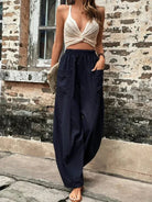 Discover your new wardrobe essential with our women's wide-leg trousers, designed for ultimate comfort and effortless style. These full-length trousers feature a relaxed fit, a breathable cotton or linen blend fabric, and a flexible elasticated high waist, ensuring all-day ease. Equipped with prominent front patch pockets, they offer a perfect balance of practicality and chic, making them ideal for everything from casual outings to relaxed business casual settings.