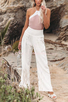 Step into relaxed style with these wide-leg trousers designed with a smocked waistband, subtle pleats, and flattering side pockets for added function. Their loose fit and breezy flow make them perfect for beach days, casual strolls, or warm-weather lounging. A staple piece that balances comfort, style, and a naturally elegant look for everyday wear.