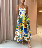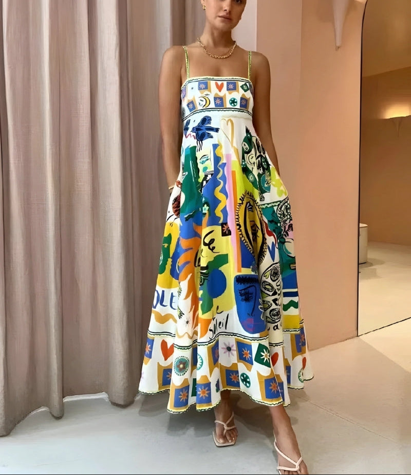 Turn everyday moments into runway moments with this colourful linen midi dress, made to celebrate movement, art, and sunny weather. Featuring slim adjustable straps, a flattering square neckline, and a vibrant abstract print, this dress radiates joyful energy. The flowing silhouette and breathable fabric make it ideal for warm-weather escapes, seaside dinners, or gallery visits with flair.