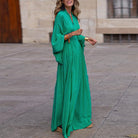 Elevate your wardrobe with this elegant long sleeve V-neck dress, designed to offer both style and comfort. The defined waist accentuates your silhouette, while the flowy hem adds a touch of femininity. Perfect for office wear, evening events, or casual outings, this dress is a versatile addition to your collection.