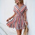 Embrace Effortless Style with Our Women's Multi-Colored Striped Short Sleeve Wrap Dress