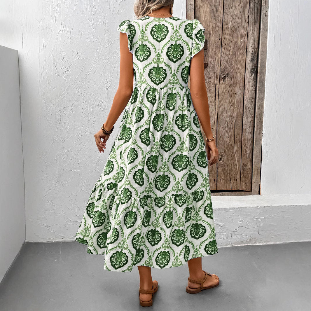 Step into effortless elegance and vibrant style with our Women's Tiered Floral Midi Dress. Designed with an elegant tiered silhouette that boasts a beautiful flow, this dress is adorned with a lively floral pattern and charming ruffle sleeves for a delicate, feminine touch. Crafted from lightweight, breathable fabric, it offers a comfortable fit while being incredibly versatile for various occasions, from casual outings and beach days to garden parties or even dressed up with heels.